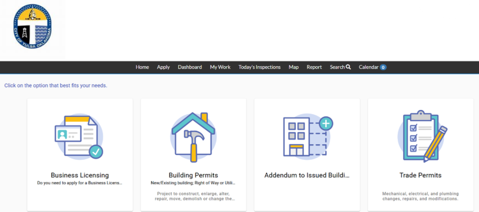 City of Tulsa’s Online Permit Application’s Decision Engine Tool helps customers navigate the permit application process based on project type with user-friendly icons and explanations.